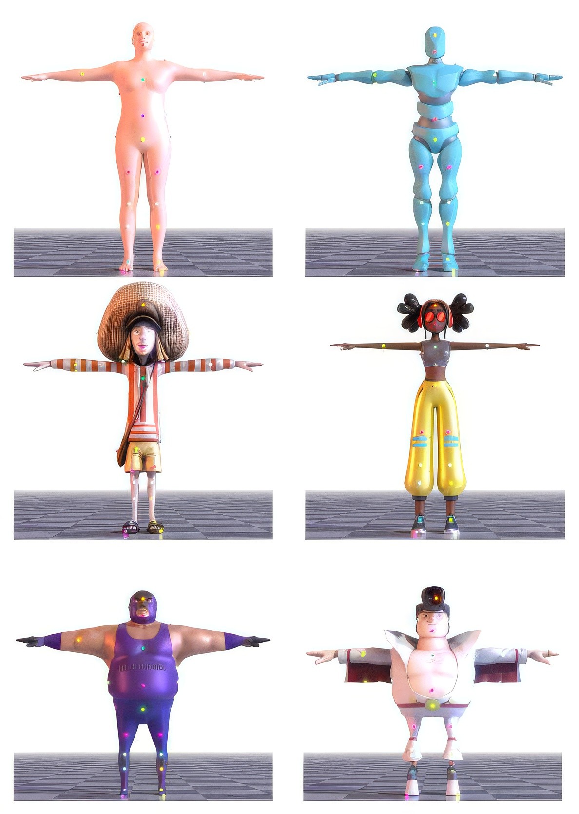 This process is entirely automatic: given any humanoid character with a skeleton and a skinned mesh, our method can identify where its key vertices should be, regardless of the character's proportions or mesh density - as long as it keeps a bipedal structure.